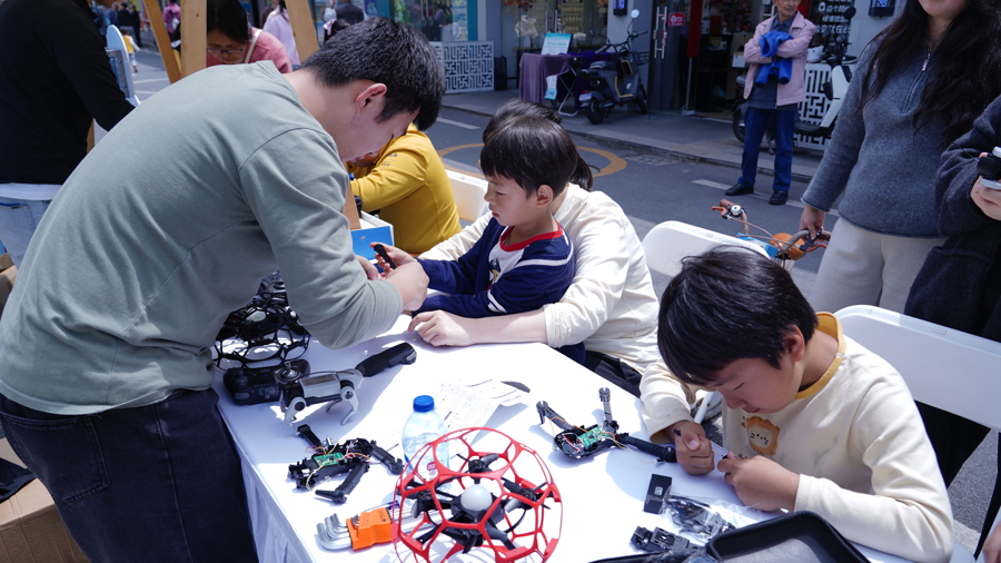 互动体验区成为现场人气最旺的区域。自制小电风扇、感应飞行器、机械狗、温度计、永动笔、无人机等丰富多样的互动项目依次亮相,孩子们与家长携手动手组装,在实践操作中理解电路原理、热胀冷缩、空气动力、光传导等科学知识,在欢声笑语中感受科学魅力、收获创造乐趣,实现“玩中学、学中乐”。